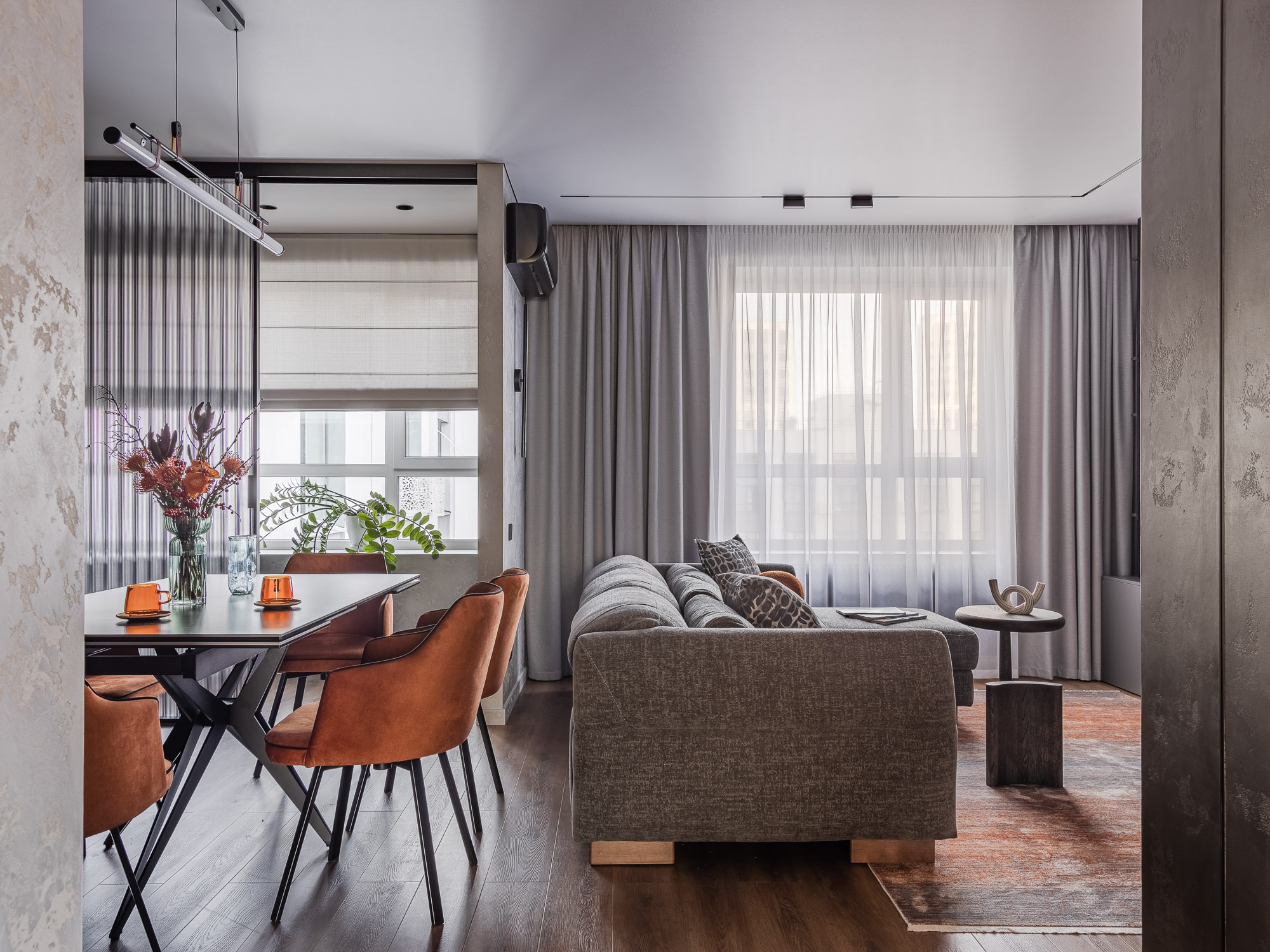 Этот интерьер создан с заботой о комфорте и уюте для всей семьи. Он наполнен серыми, бежевыми и белыми тонами, которые создают атмосферу спокойствия и гармонии.
