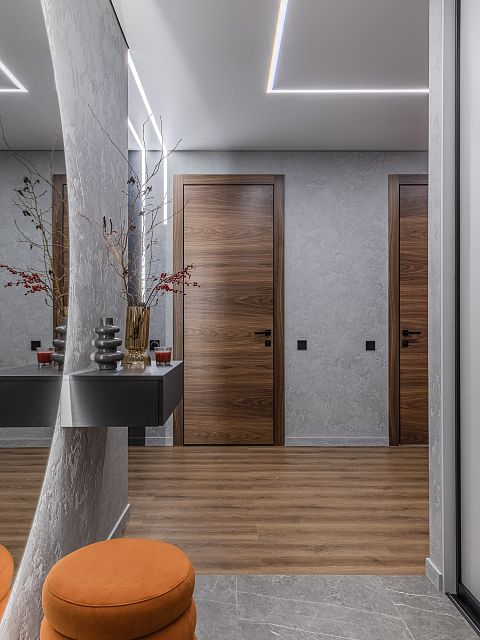 В проекте использованы межкомнатные двери Porte 39-00 с покрытием из натурального шпона. Это не только красиво, но и практично, так как такие двери отлично вписываются в общий стиль. Также была применена дверь скрытого монтажа под покраску, за которой спрятана детская гардеробная. Это — мечта каждой девочки, обеспечивающая порядок и достаточное пространство для хранения вещей.