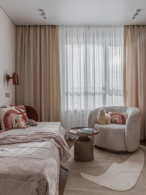 Детская комната выполнена в приятных бежево-коричневых тонах, что создает теплую и уютную обстановку для игр и отдыха. Здесь каждая деталь продумана для удобства и радости маленького жителя.