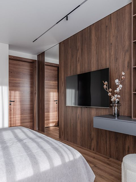 Спальня хозяев украшена элементами из дерева, придающими интерьеру природность и теплый характер. Эти детали делают атмосферу еще более домашней и расслабляющей.