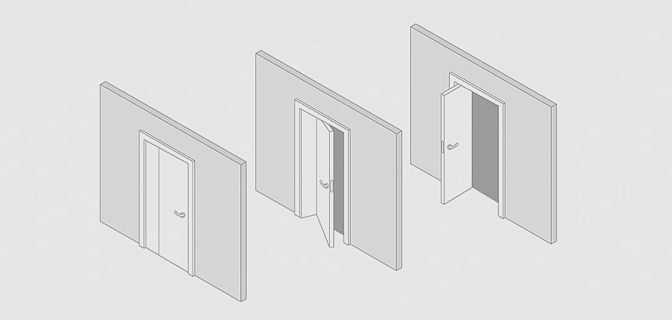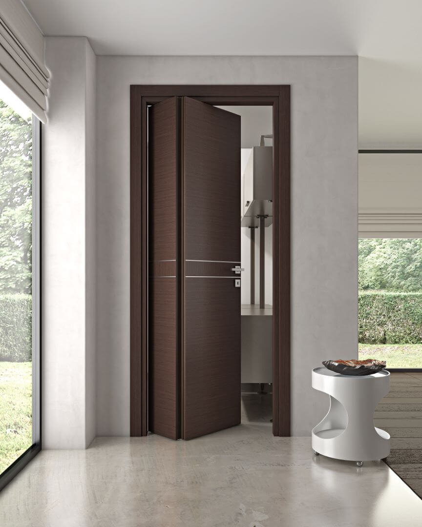 Еще одна складная система открывания, только дверь складывается не пополам, а в соотношении 1/3 и 2/3, перпендикулярно проему. При открывании двери нет необходимости делать это полностью – достаточное место для прохода обеспечивается даже неполным открытием.